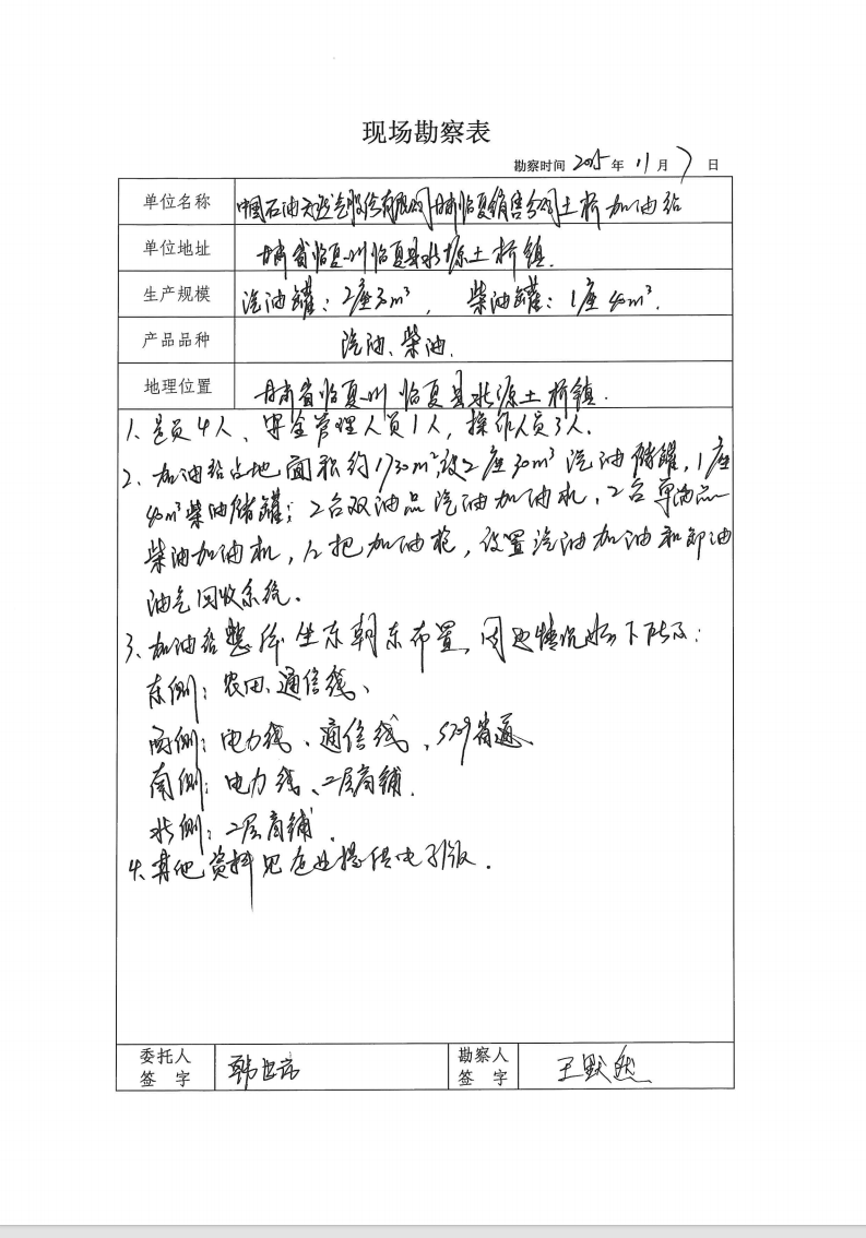 项目概况:该加油站成立于2001年6月4日,经营范围包括:危险化学品经营,成品油零售等。该加油站占地面积约1730㎡,站内设有3座储油罐,其中包括2座30m³汽油储罐和1座40m³柴油储罐;2台双油品汽油加油机,2台单油品柴油加油机,12把加油枪,设置汽油加油和卸油油气回收系统。站内建有站房、配电室等相应的配套设施等。