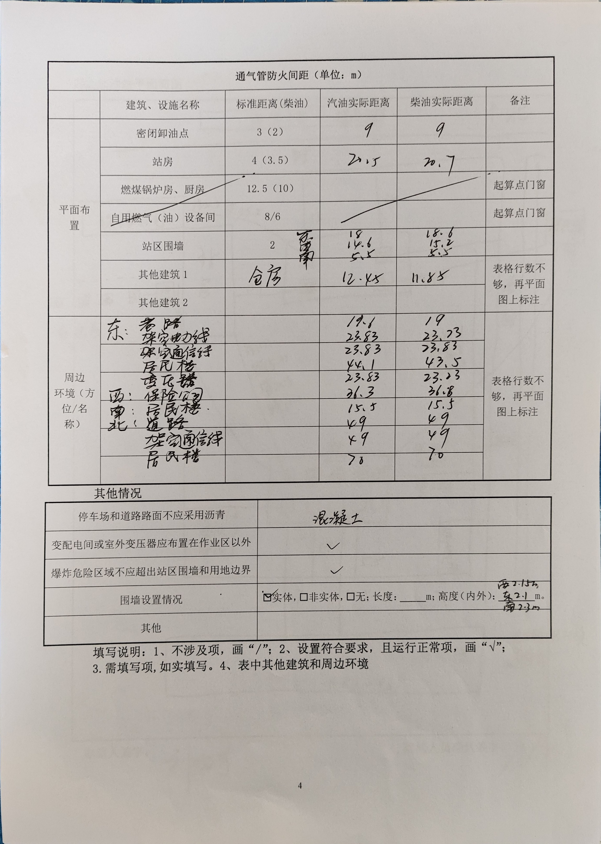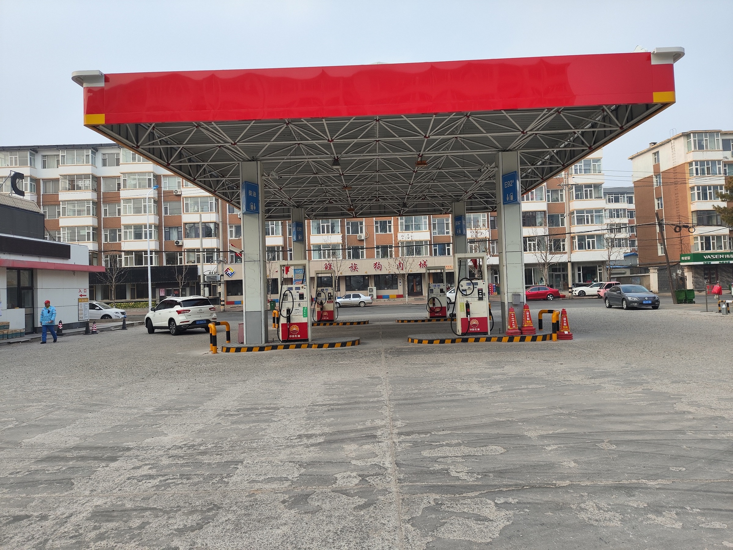 该加油站站房占地面积141.3m2,站房由营业室、值班室、厨房、便利店、配电室、卫生间等组成;罩棚1座,投影面积220m2,罩棚净空高度5.5m;该加油站设4台自吸泵式加油机。站房西侧为充电区,设有4台双枪充电桩、1台整流柜及1台箱式变压器。