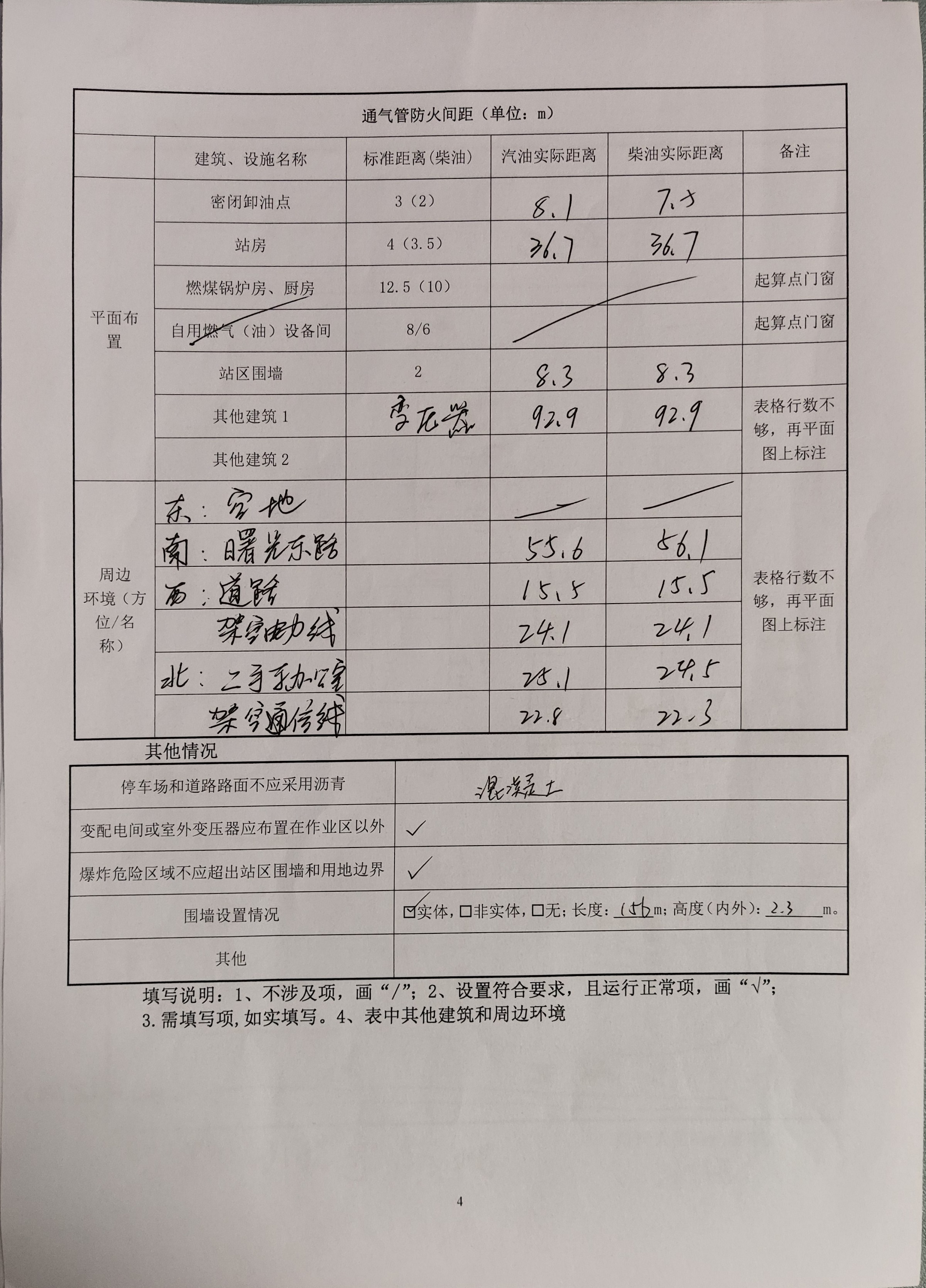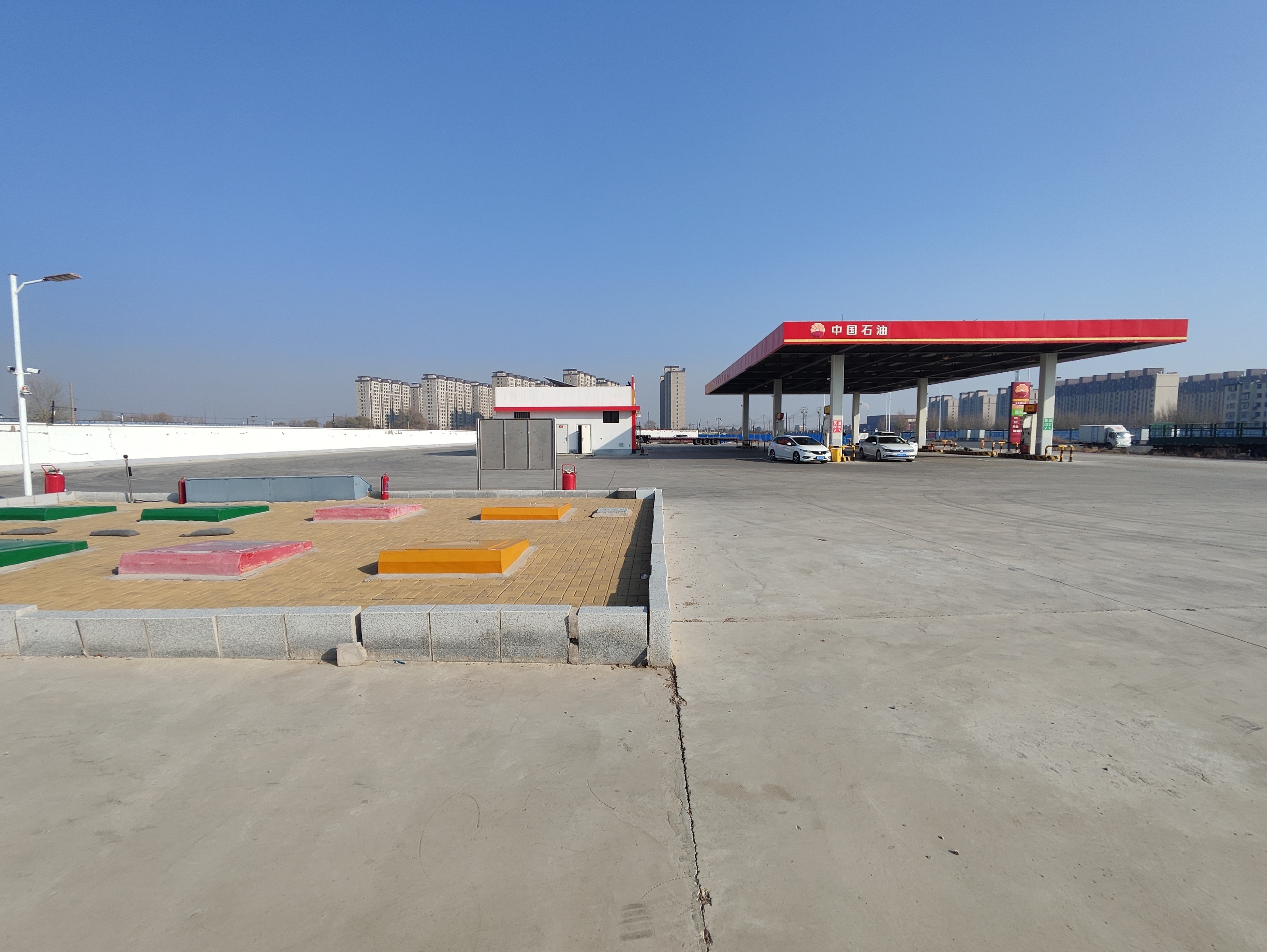该加油站站房占地面积150m2,站房由营业室、值班室、厨房、便利店、配电室等组成;罩棚1座,投影面积740m2,罩棚净空高度7m;该加油站设3台潜油泵式双枪加油机。