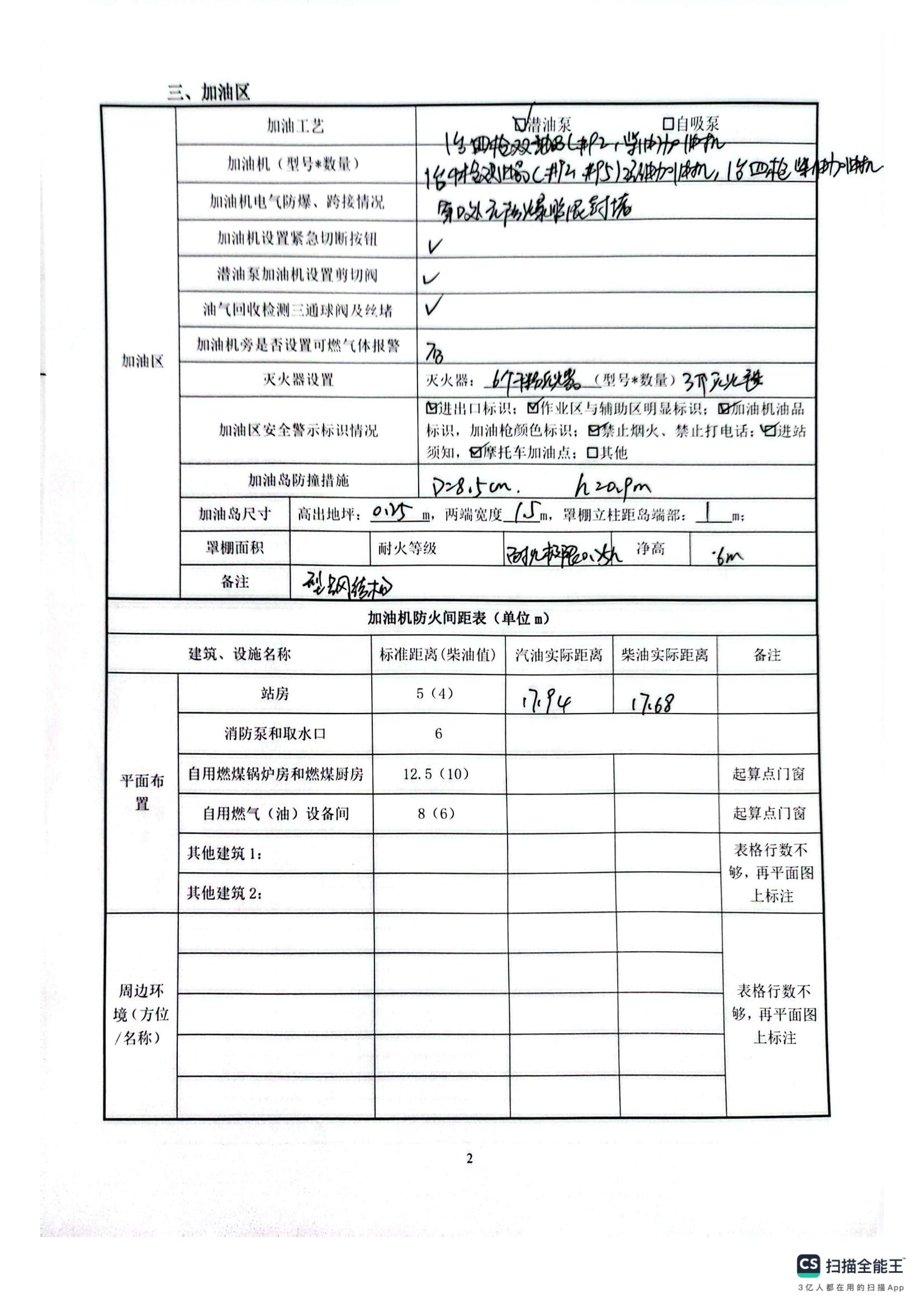 该站站房建筑面积236.53m2,站房由营业室、值班室、办公室、卫生间、便利店、配电间等组成;罩棚1座,投影面积为375.86m2,罩棚净空高度6m;该站共设3台加油机,其中1台为四枪双油品潜油泵式汽油加油机,1台为四枪潜油泵式柴油加油机,1台为四枪双油品潜油泵式汽柴油加油机。