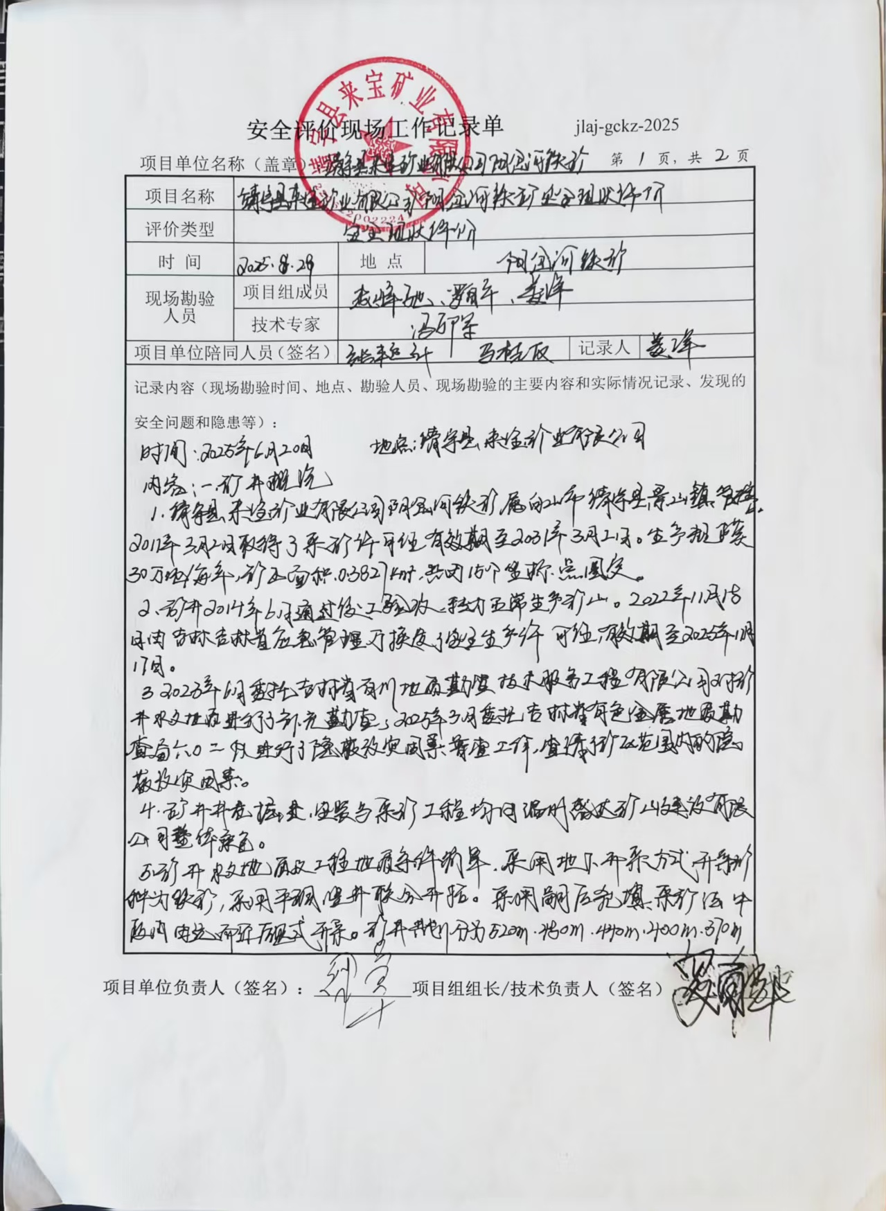2025年3月,委托吉林省有色金属地质勘查局六0二队进行了隐蔽致灾因素普查工作,编制了《靖宇来宝矿业有限公司阳岔河铁矿隐蔽致灾因素普查报告》,查清了矿区范围内的隐蔽致灾因素。