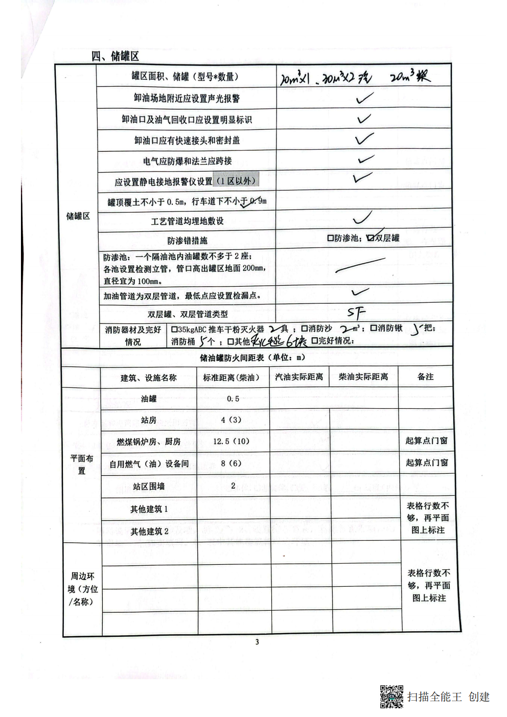 项目概况:该站油罐区设有4座内钢外玻璃纤维增强塑料(SF)双层油罐,其中2座30m3、1座20m3汽油罐,1座20m3柴油罐,总罐容90m3(柴油罐容积折半),依据《汽车加油加气加氢站技术标准》(GB50156-2021)第3.0.9条的规定,该站属于三级加油站。