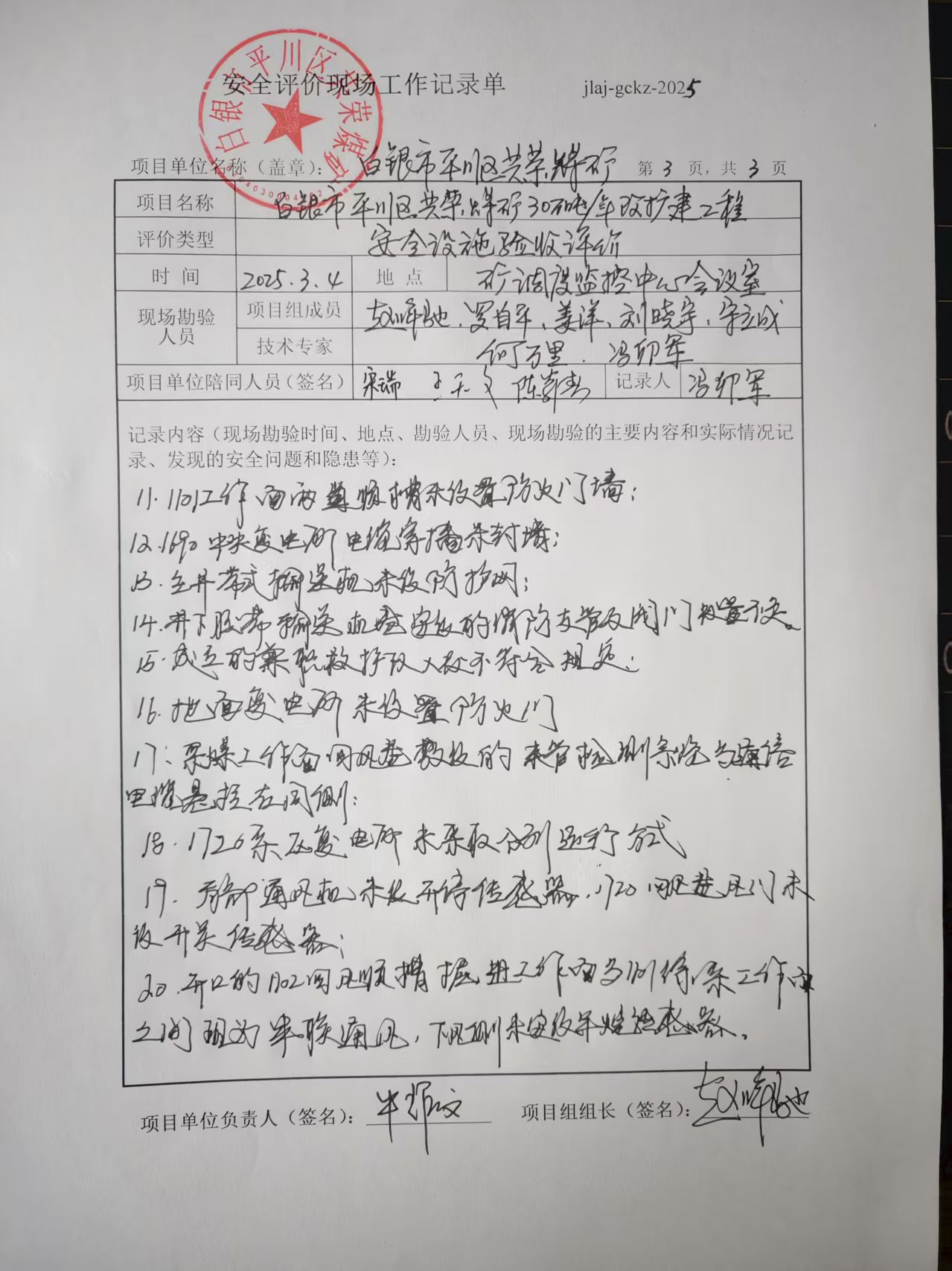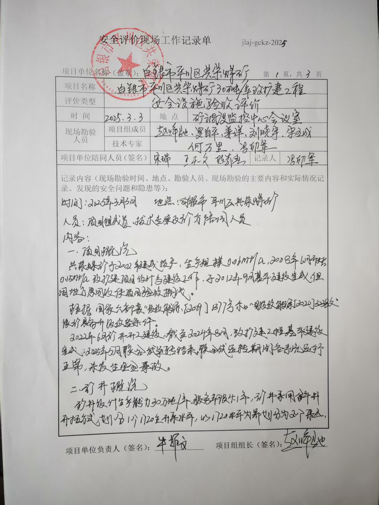 项目名称:白银市平川区共荣煤矿 0.3Mt/a改扩建项目安全设施验收评价