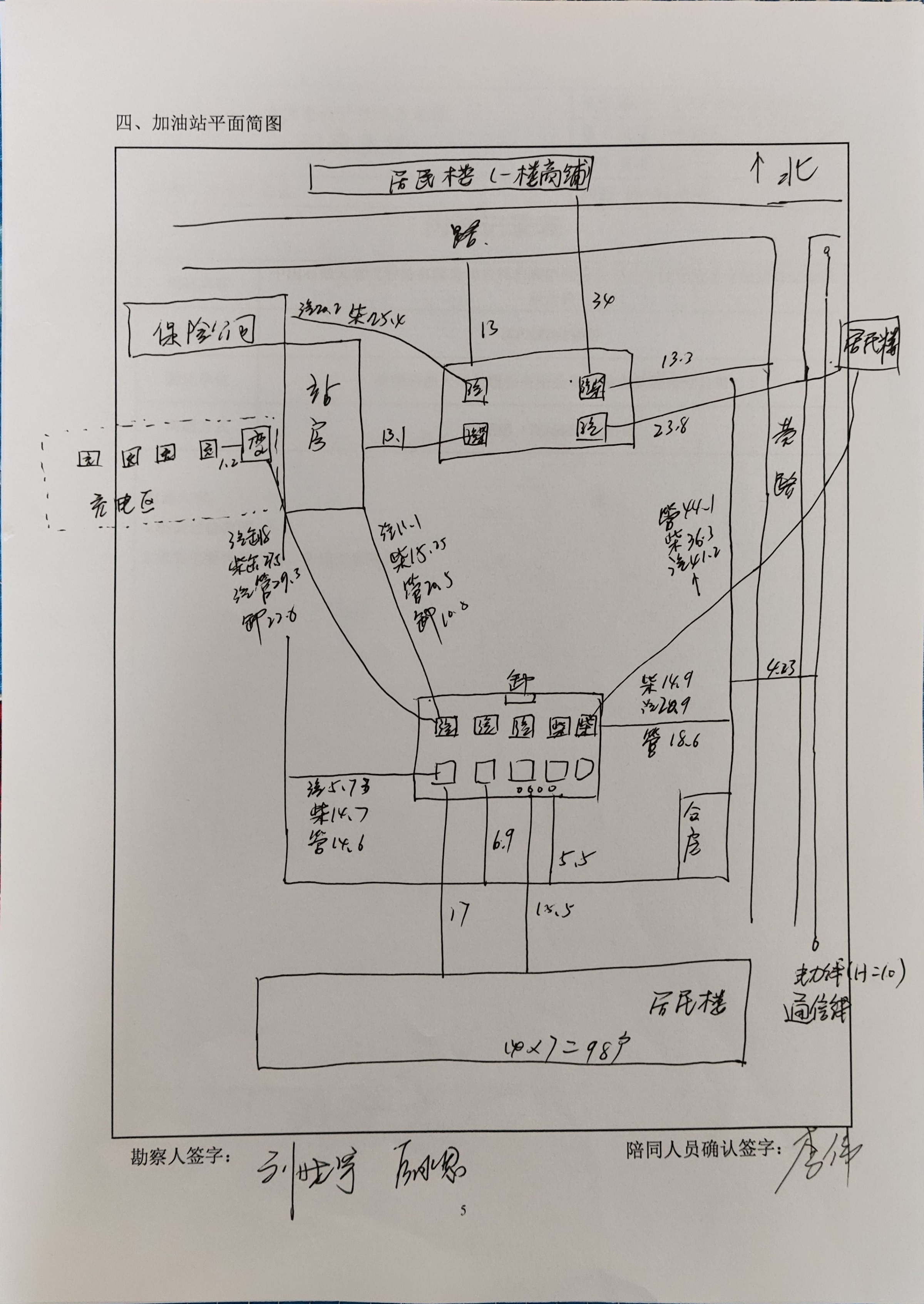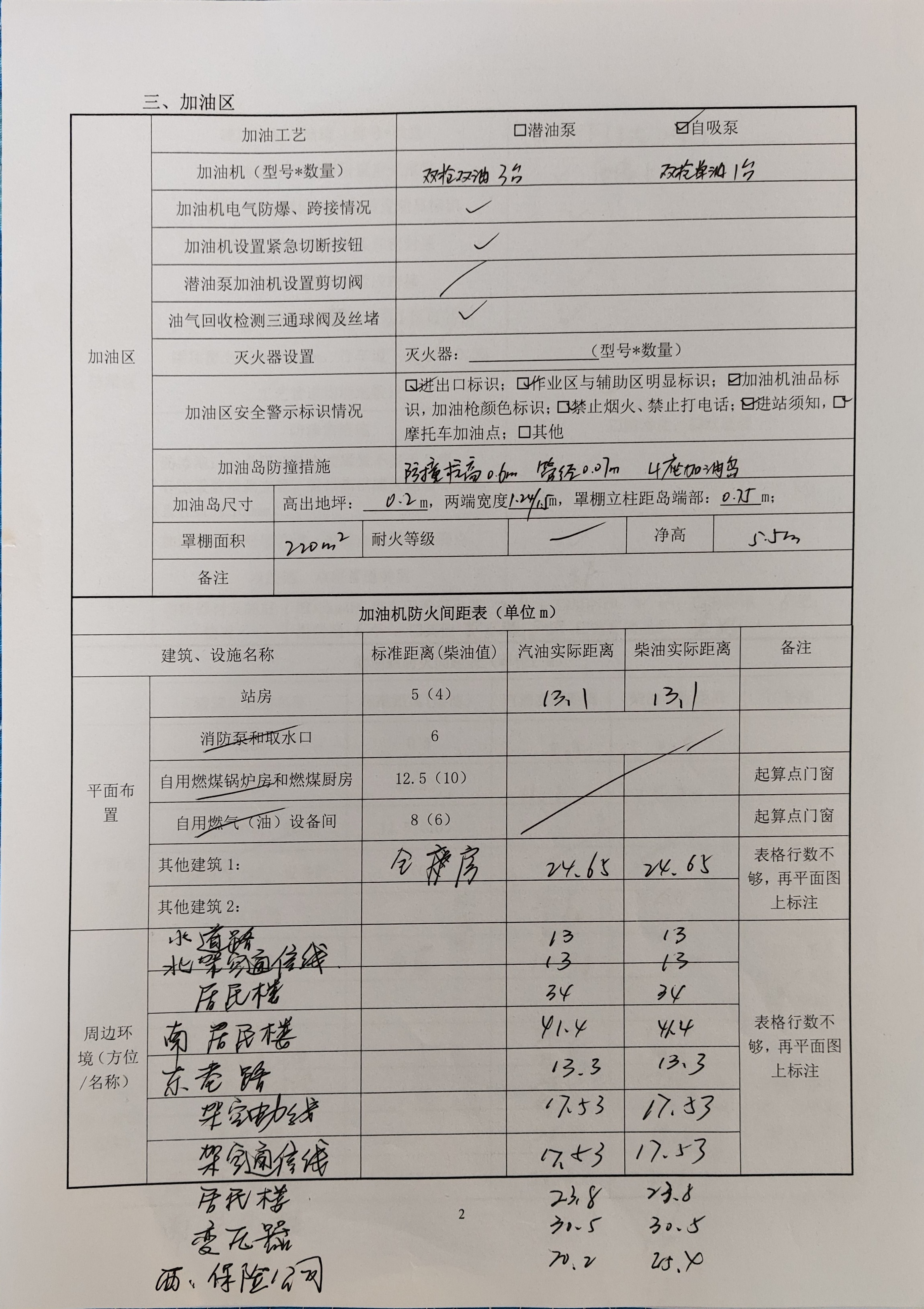 该加油站站房占地面积141.3m2,站房由营业室、值班室、厨房、便利店、配电室、卫生间等组成;罩棚1座,投影面积220m2,罩棚净空高度5.5m;该加油站设4台自吸泵式加油机。站房西侧为充电区,设有4台双枪充电桩、1台整流柜及1台箱式变压器。