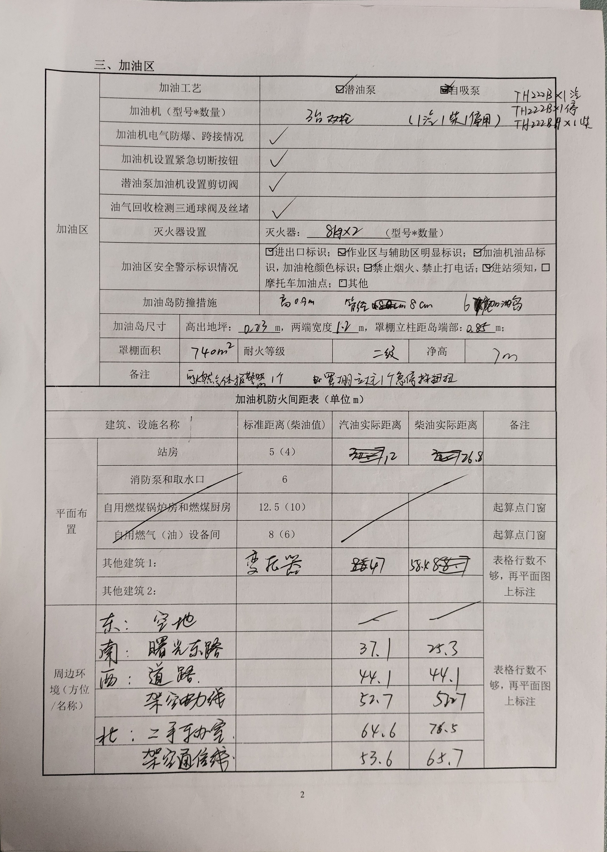 该加油站站房占地面积150m2,站房由营业室、值班室、厨房、便利店、配电室等组成;罩棚1座,投影面积740m2,罩棚净空高度7m;该加油站设3台潜油泵式双枪加油机。