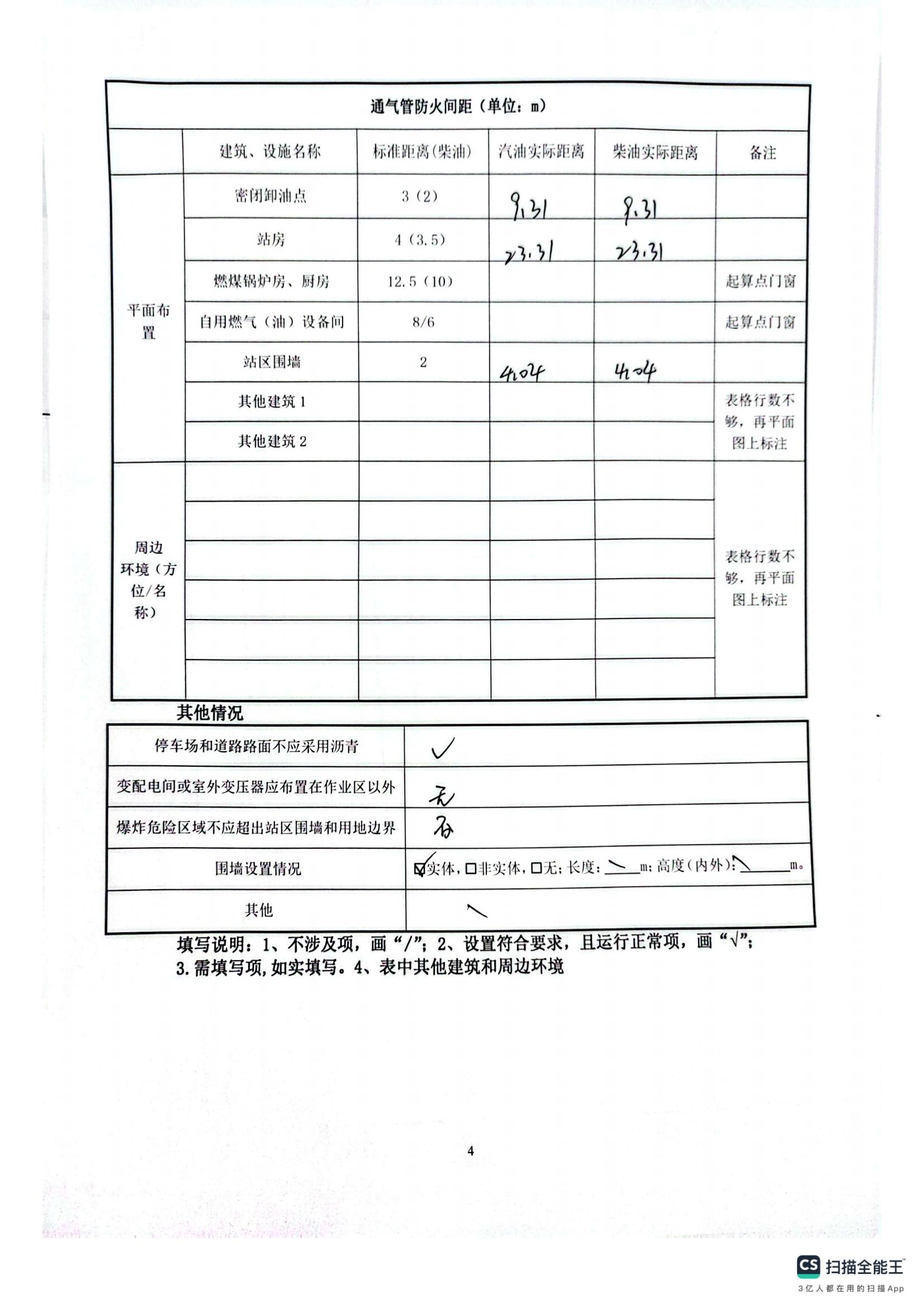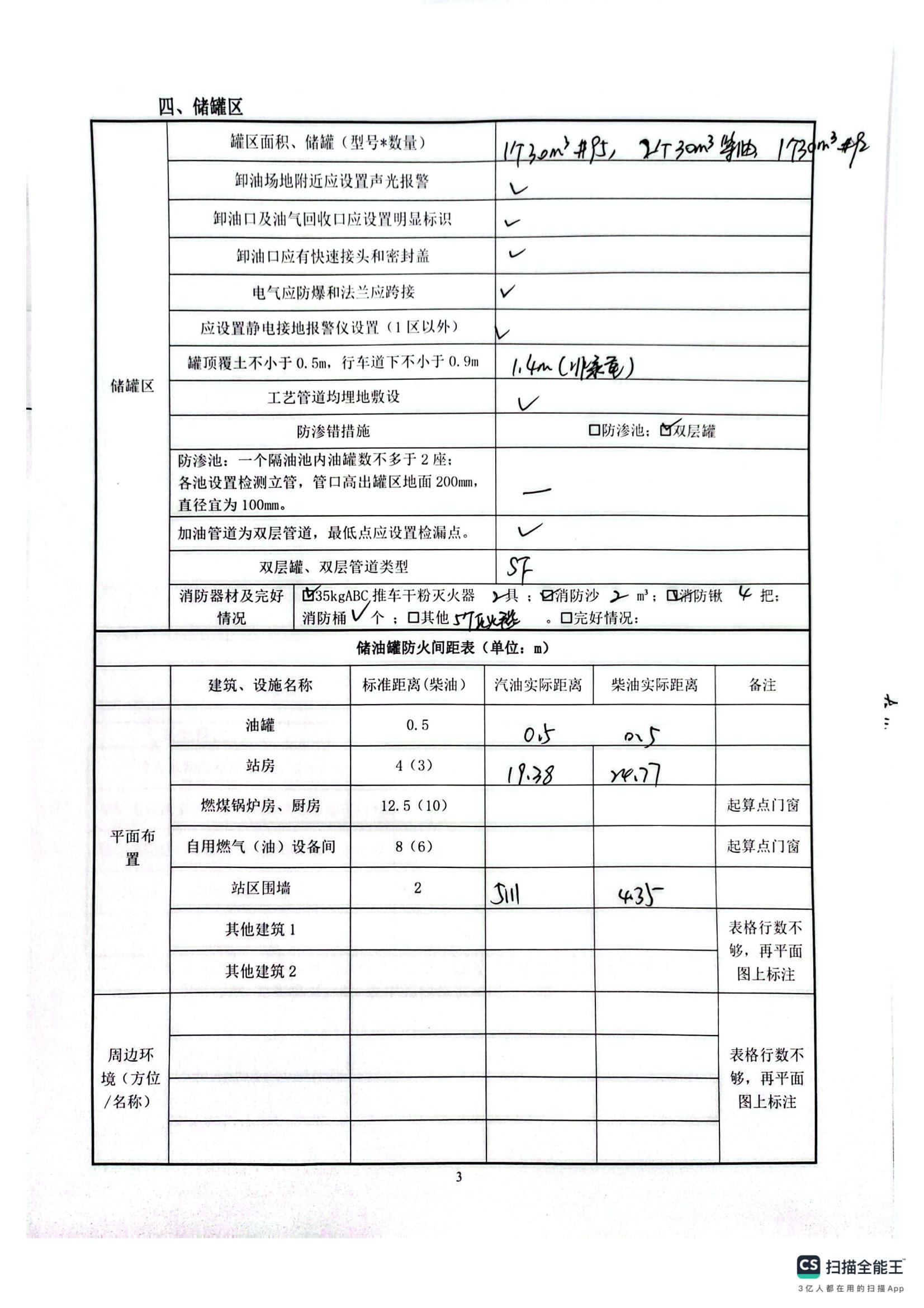 该站油罐区共设有4座内钢外玻璃纤维增强塑料(SF)双层油罐,其中现有30m3乙醇汽油储罐2座,30m3柴油储罐2座,总容积90m3(柴油罐容积折半计入油罐总容积),依据《汽车加油加气加氢站技术标准》(GB50156-2021)第3.0.9条的规定,该站属于三级加油站。