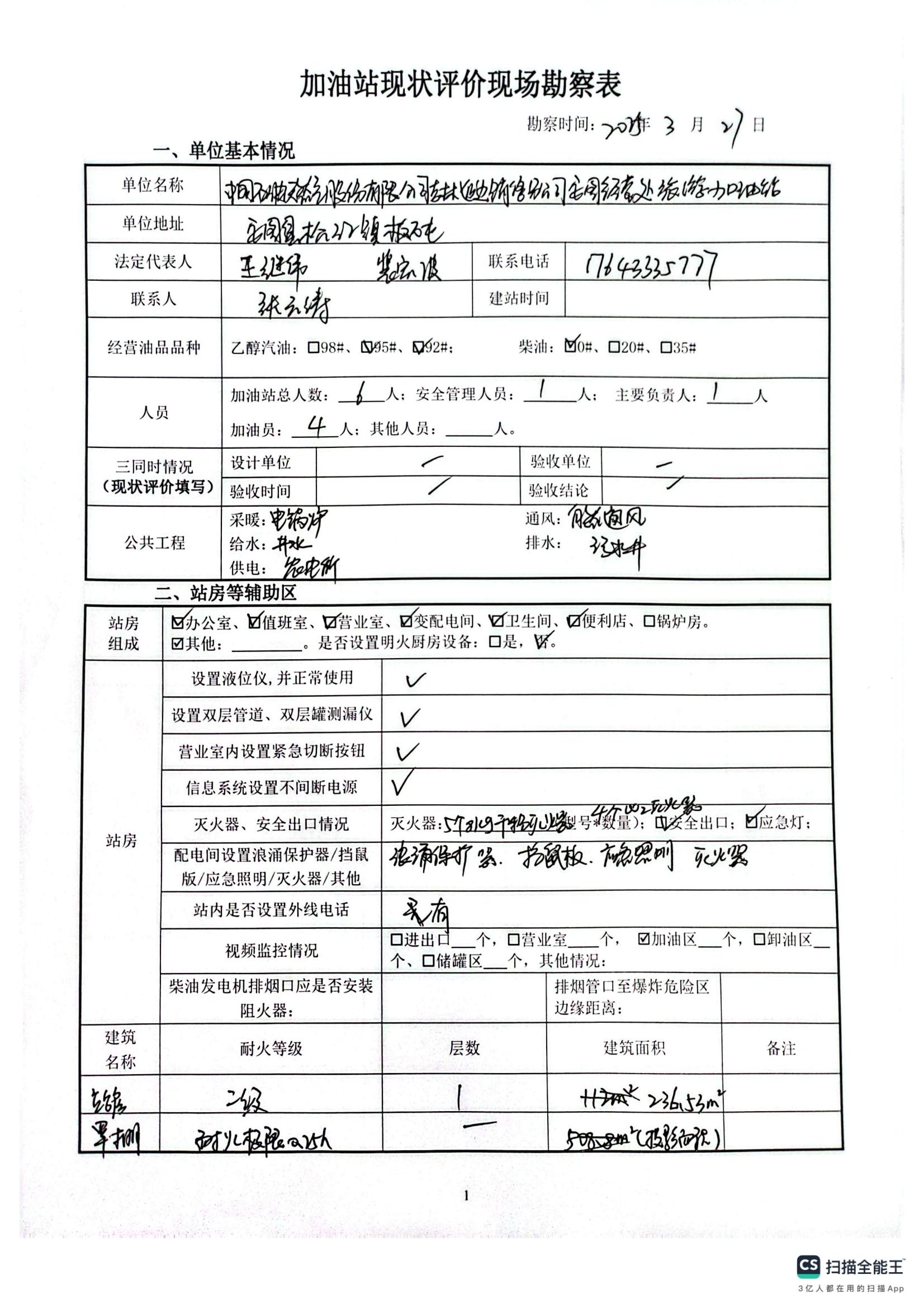 该站站房建筑面积236.53m2,站房由营业室、值班室、办公室、卫生间、便利店、配电间等组成;罩棚1座,投影面积为375.86m2,罩棚净空高度6m;该站共设3台加油机,其中1台为四枪双油品潜油泵式汽油加油机,1台为四枪潜油泵式柴油加油机,1台为四枪双油品潜油泵式汽柴油加油机。
